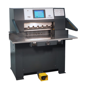The intuitive 10.5" colour touch-screen TC Controller allows variable mode data entry, automatic fraction to decimal calculation and unlimited program storage capacity. Clamp mark waste is reduced or eliminated with programmable electronic clamp pressure control per cut. Innovative advances improve the task of program creation through features such as repeat and loop commands, USB port for thumb drive program delivery, label cutting and sheet division tools, and more! The TC system is the first paper cutter controller in the world to recognize common .csv format program files making offline programming simple and easy to implement at any size print operation.