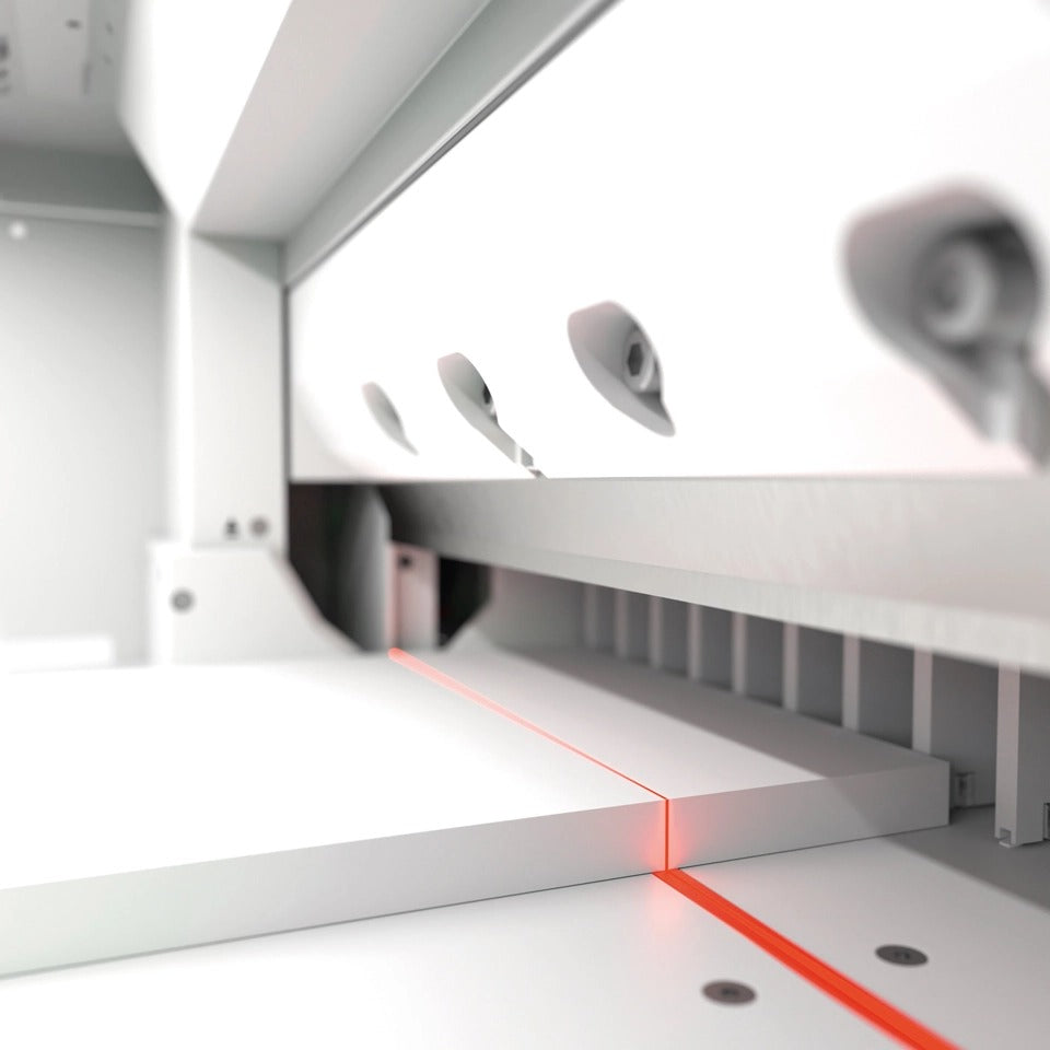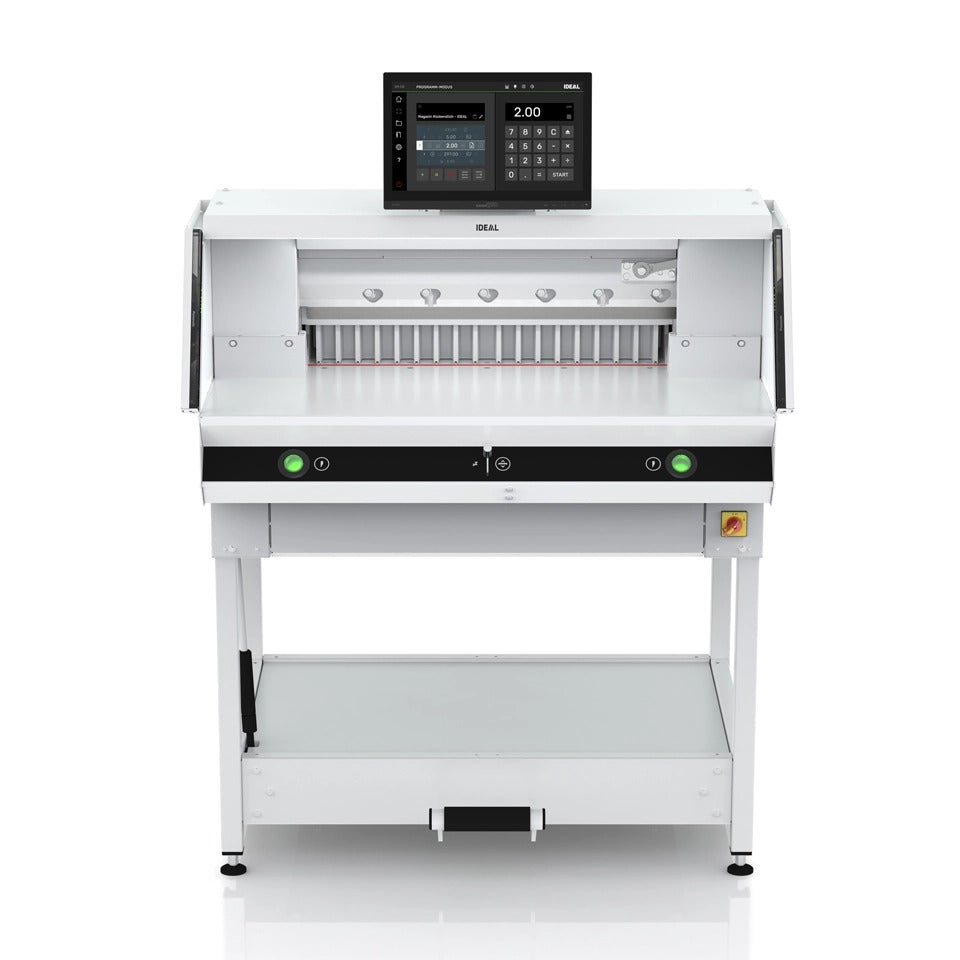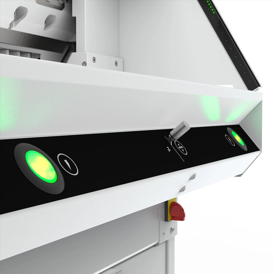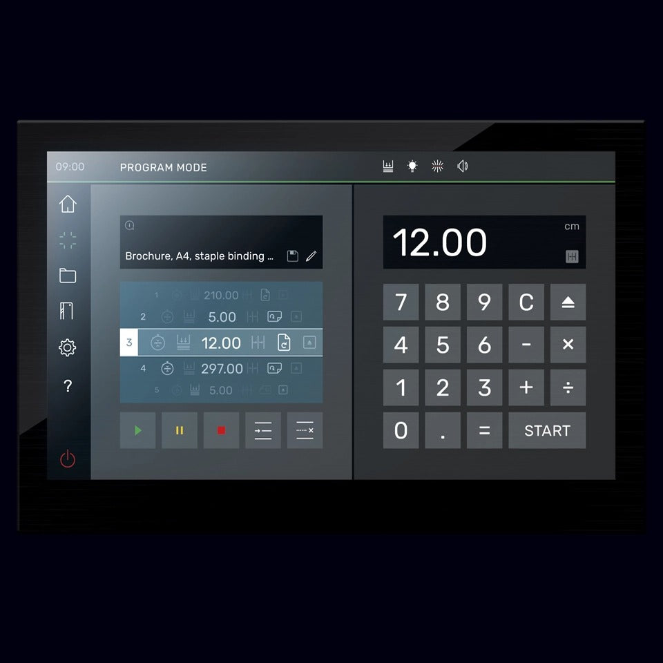 The Triumph Speedcut 68 is the next-generation, programmable hydraulic-powered paper cutter that enhances efficiency and productivity with its advanced features. The 15.6” multi-touch display offers intuitive software with easy touch and swipe operation, providing a clear main screen and intelligently split display. The tilt-adjustable display can be customized to suit body height and lighting conditions. Precision is ensured with the manual fine adjustment of the backgauge, operated via an ergonomic control element. Safe, two-hand operation is achieved with EASY-TOUCH cut-activating buttons and integrated optical signals. The mechanical foot clamp features ergonomic, patented pre-clamping, and cutting line indication functionality, offering ultimate convenience and precision.